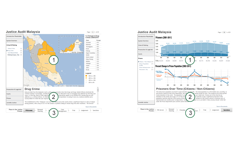The Justice Audit Malaysia website report is organized into “Chapters” and “Pages,” which are listed vertically in a frame on the left side of the view. By “clicking” the cursor on the bold Chapter titles, the viewer is taken from the currently viewed Chapter’s list of Pages to the desired Chapter’s list of Pages in a closing-and-opening, accordion fashion. By clicking on any of the numbered Page titles below the Chapter heading, the viewer is provided with the graphical, tabular, and narrative information covering that Page’s topic.